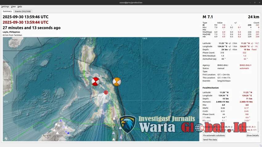 InvestigasiWartaGlobal.id | Jakarta – Selasa malam (30/9/2025) pukul 20:59:43 WIB, getaran dahsyat mengguncang Calape, Filipina. BMKG mencatat gempabumi tektonik berkekuatan Magnitudo 6,9 dengan pusat guncangan di koordinat 11,15° LU; 124,14° BT pada kedalaman 10 km.