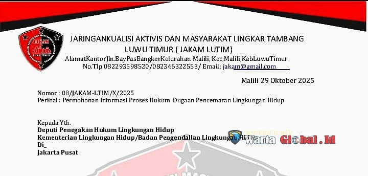Makassar,Investigasi.wartaglobal.id — Jaringan Koalisi Aktivis Masyarakat Lingkar Tambang Luwu Timur (JAKAM Lutim) resmi melayangkan surat permohonan informasi dan desakan penegakan hukum kepada Deputi Penegakan Hukum Lingkungan Hidup, Kementerian Lingkungan Hidup / Badan Pengendalian Lingkungan Hidup, terkait dugaan pencemaran lingkungan akibat kebocoran pipa minyak milik PT Vale Indonesia Tbk yang terjadi pada 23 Agustus 2025 di Kecamatan Towuti, Kabupaten Luwu Timur.