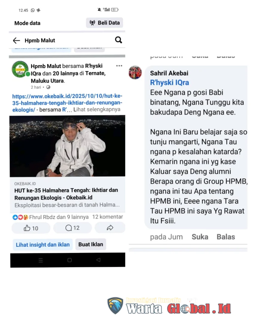 Ternate, Wartaglobal.id - Himpunan Pelajar Mahasiswa Bilifitu (HPMB) Maluku Utara mengecam keras tindakan intimidasi verbal yang dilakukan oleh seorang pemuda berinisial SI alias Sahril Isahk terhadap Ketua HPMB Malut, Riski Ikra, melalui kolom komentar di media sosial Facebook. Kasus tersebut terjadi pada Senin, 13 Oktober 2025, dan kini mendapat perhatian serius dari organisasi tersebut.