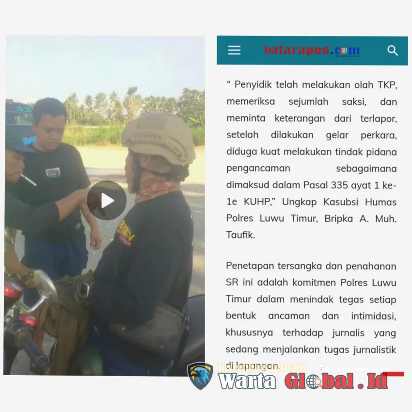 Luwu Timur,Investigasiwartaglobal.id — Aliansi Media Jurnalis Independen Republik Indonesia (AMJI RI) bersama Lembaga Lak-HAM Indonesia (LHI) menilai langkah penyidik Polres Luwu Timur yang menetapkan SR (56), oknum penambang galian C, sebagai tersangka intimidasi terhadap jurnalis dengan Pasal 335 ayat (1) KUHP adalah langkah yang tidak tepat dan berpotensi melemahkan penegakan hukum.
