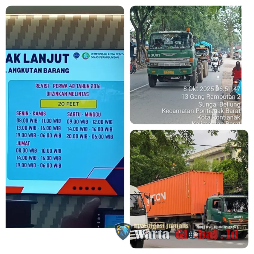 Kalbar.INVESTIGASI.WARTAGLOBAL.id-- Pontianak, 9 Oktober 2025, meskipun Pemerintah Kota Pontianak telah berulang kali menegaskan aturan tentang jam operasional truk angkutan barang, rupanya masih banyak kendaraan besar yang nekat beroperasi di luar waktu yang telah ditetapkan.