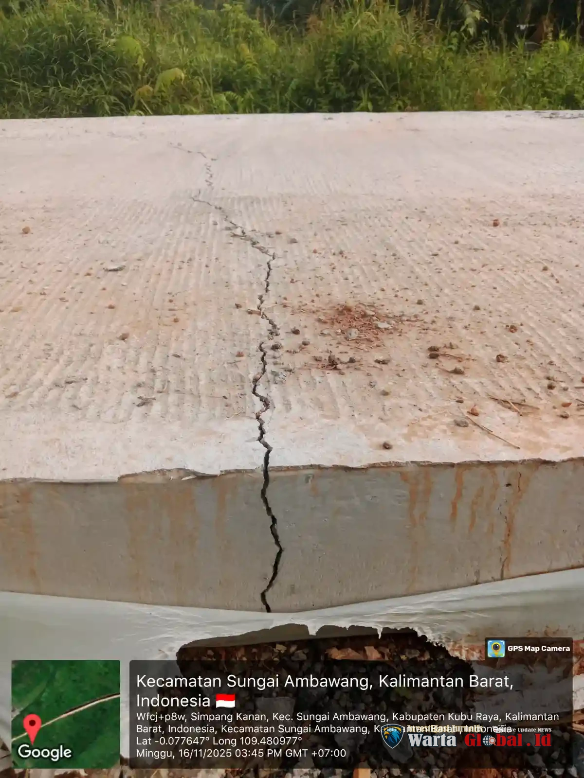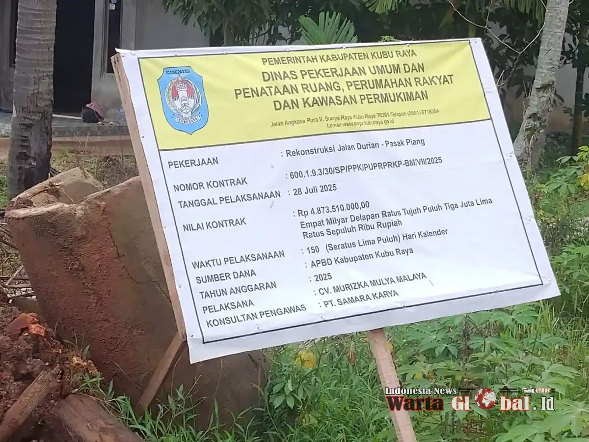 Kalbar.INVESTIGASI.WARTAGLOBAL.id-- Kubu Raya, 16 November 2025, Proyek pembangunan jalan di Desa Durian, Kecamatan Sungai Ambawang, Kabupaten Kubu Raya, yang menelan anggaran Rp4.873.510.000 (± Rp4,8 miliar), kini menjadi sorotan tajam publik. Alih-alih memberikan manfaat jangka panjang, jalan yang baru saja dikerjakan itu justru telah menunjukkan keretakan di berbagai titik, seakan menegaskan dugaan bahwa pengerjaan dilakukan tanpa standar teknis yang semestinya.