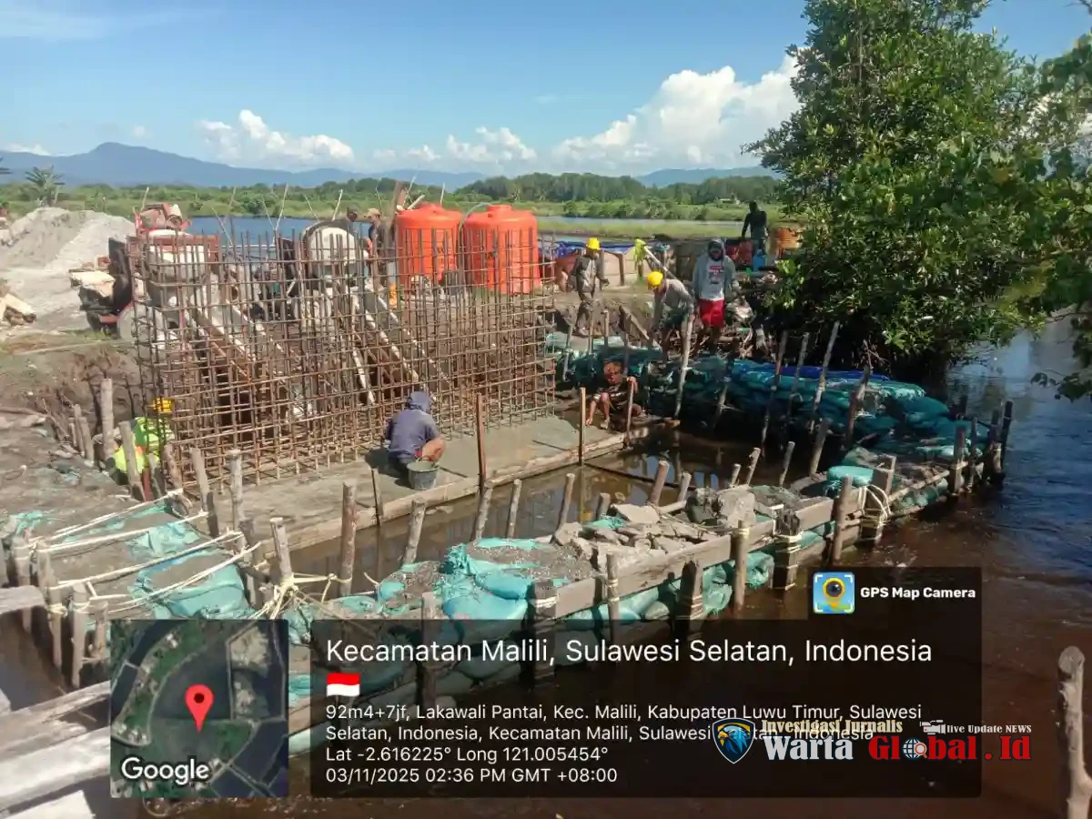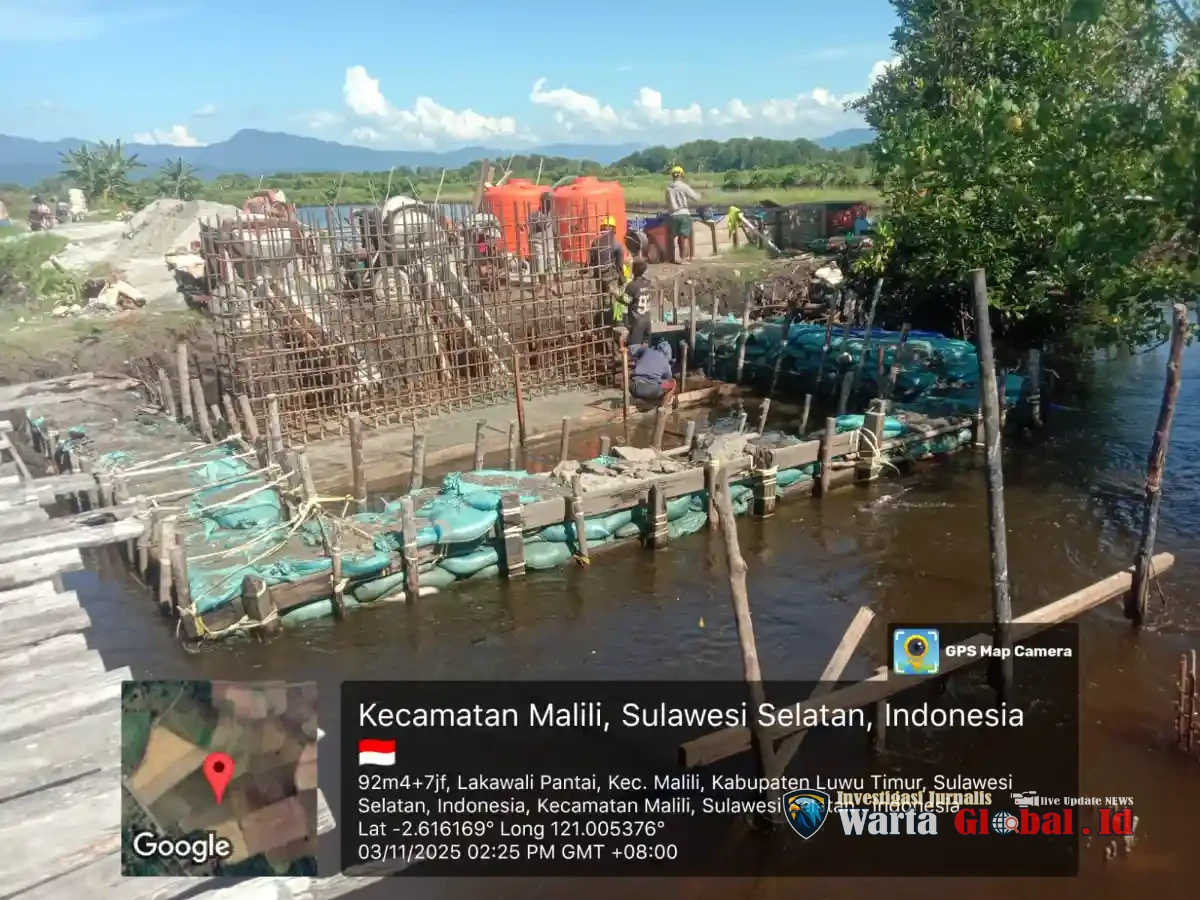 LUWU TIMUR,Investigasiwartaglobal.id — Pekerjaan pembangunan jembatan di Desa Lakawali Pantai, Kecamatan Malili, Kabupaten Luwu Timur, Sulawesi Selatan, menuai sorotan warga. Proyek yang disebut-sebut bernilai lebih dari satu miliar rupiah ini dipertanyakan lantaran dinilai tidak transparan dan tidak memiliki kejelasan teknis di lapangan.