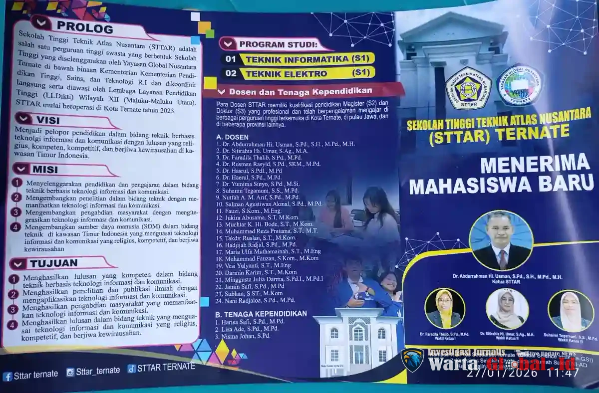 Ternate, WartaGlobal.id - PROLOG: Sekolah Tinggi Teknik Atlas Nusantara (STTAR) adalah salah satu perguruan tinggi swasta yang berbentuk Sekolah Tinggi yang diselenggarakan oleh Yayasan Global Nusantara Ternate di bawah binaan Kementerian Pendidikan Tinggi, Sains, dan Teknologi R.I dan dikoordinir langsung serta diawasi oleh Lembaga Layanan Pendidikan Tinggi (LLDikti) Wilayah XII (Maluku-Maluku Utara). STTAR mulai beroperasi di Kota Ternate tahun 2023. Saat ini telah membuka penerimaan mahasiswa baru.